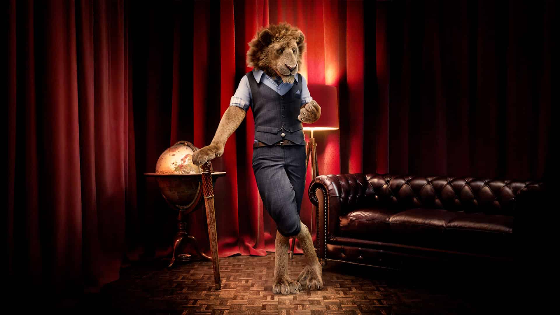 A regal lion is reimagined as a refined gentleman, impeccably dressed in a tailored waistcoat and trousers within a plush drawing room. Warm lamplight sculpts rich textures—the sheen of a leather armchair, the patina of an antique globe, and deep red curtains—while meticulous fur grooming, fabric simulation, and nuanced shaders elevate realism. Composed like a classic portrait, this CGI illustration fuses wildlife majesty with aristocratic elegance, creating a striking, cinematic character study that feels timeless and delightfully unexpected.