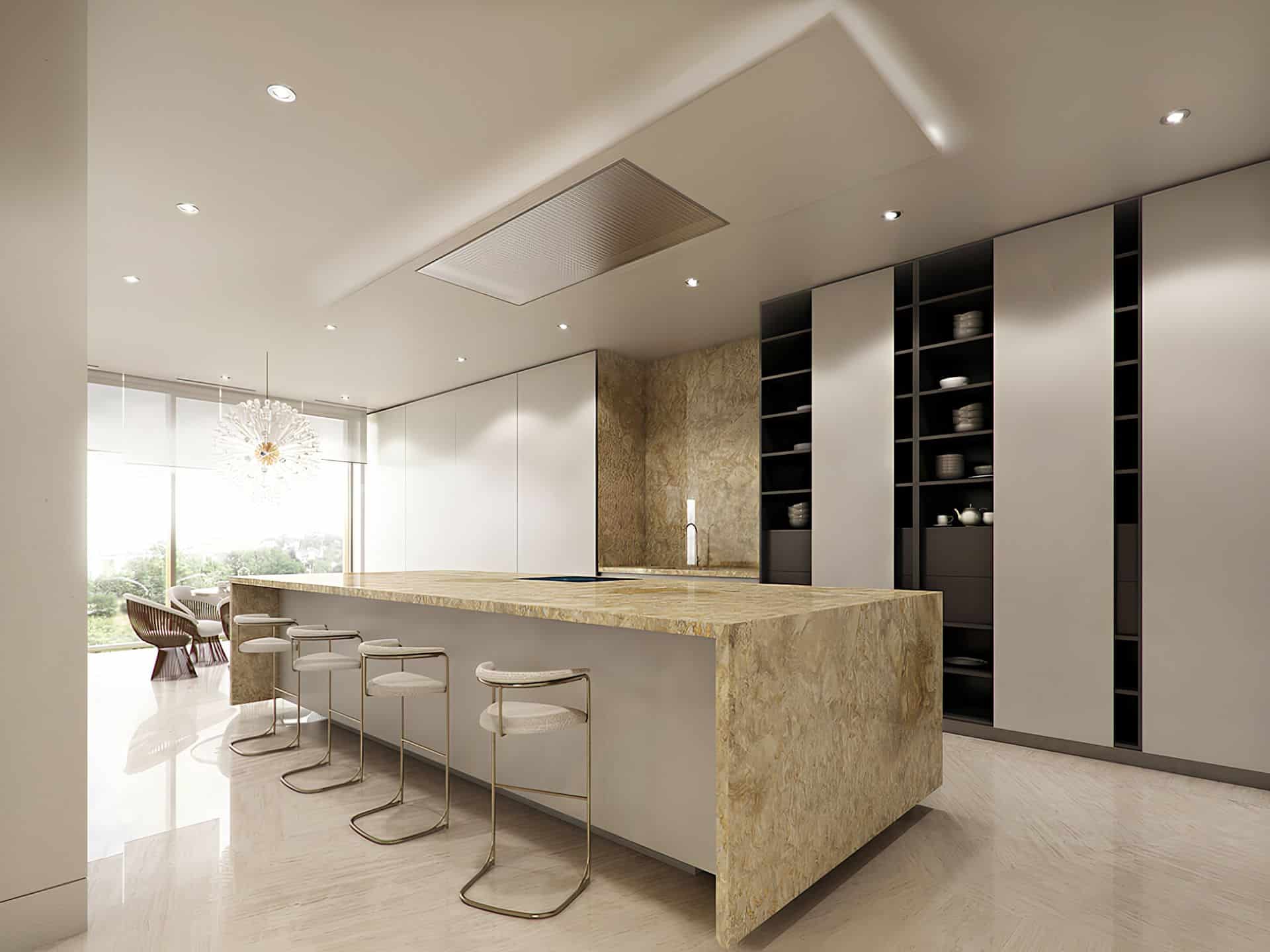 This project showcases a sophisticated and contemporary kitchen design rendered in high-fidelity CGI. The design emphasizes clean lines, premium materials, and an open-plan layout, creating a luxurious and functional space. Key features include a substantial central island with a striking marble countertop, sleek, handleless cabinetry, integrated appliances, and an atmospheric lighting scheme. The render aims to present a realistic and aspirational vision of a modern culinary and social hub.