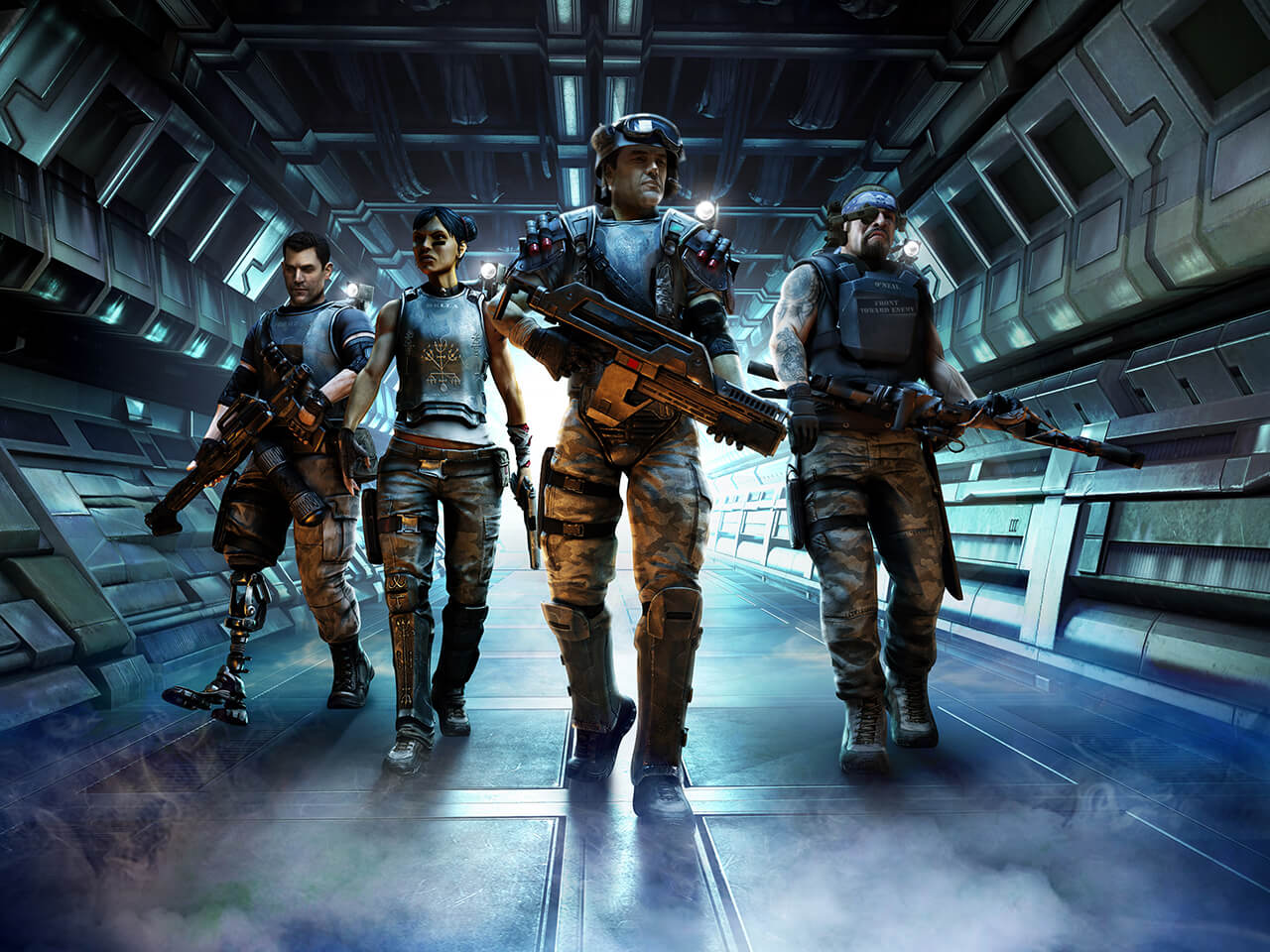 Video Game Computer Generated illustration of sci fi marines with weapons walking inside a futuristic spaceship