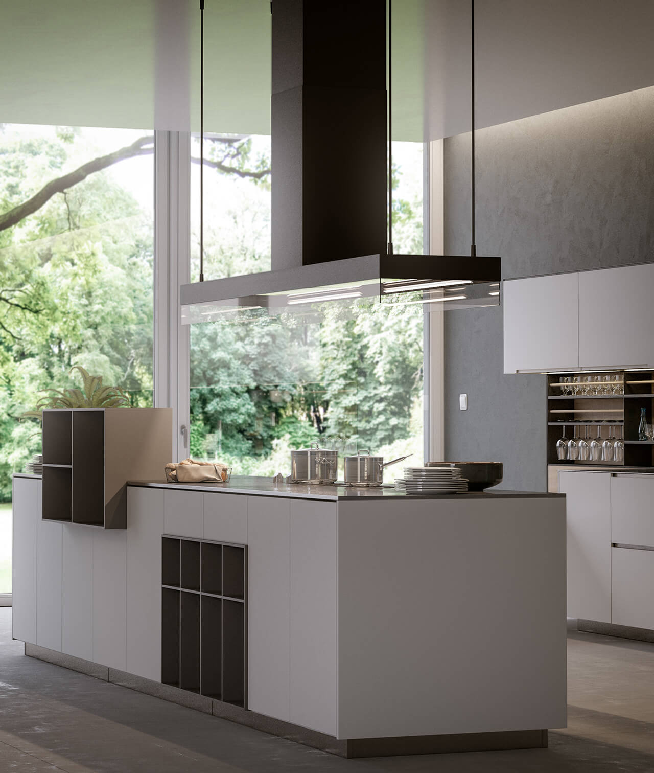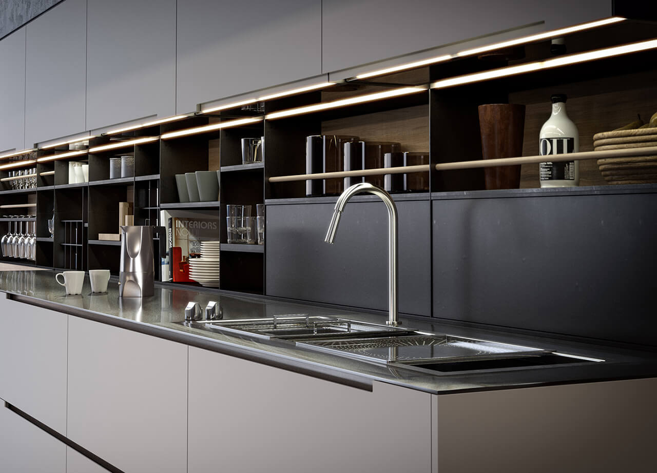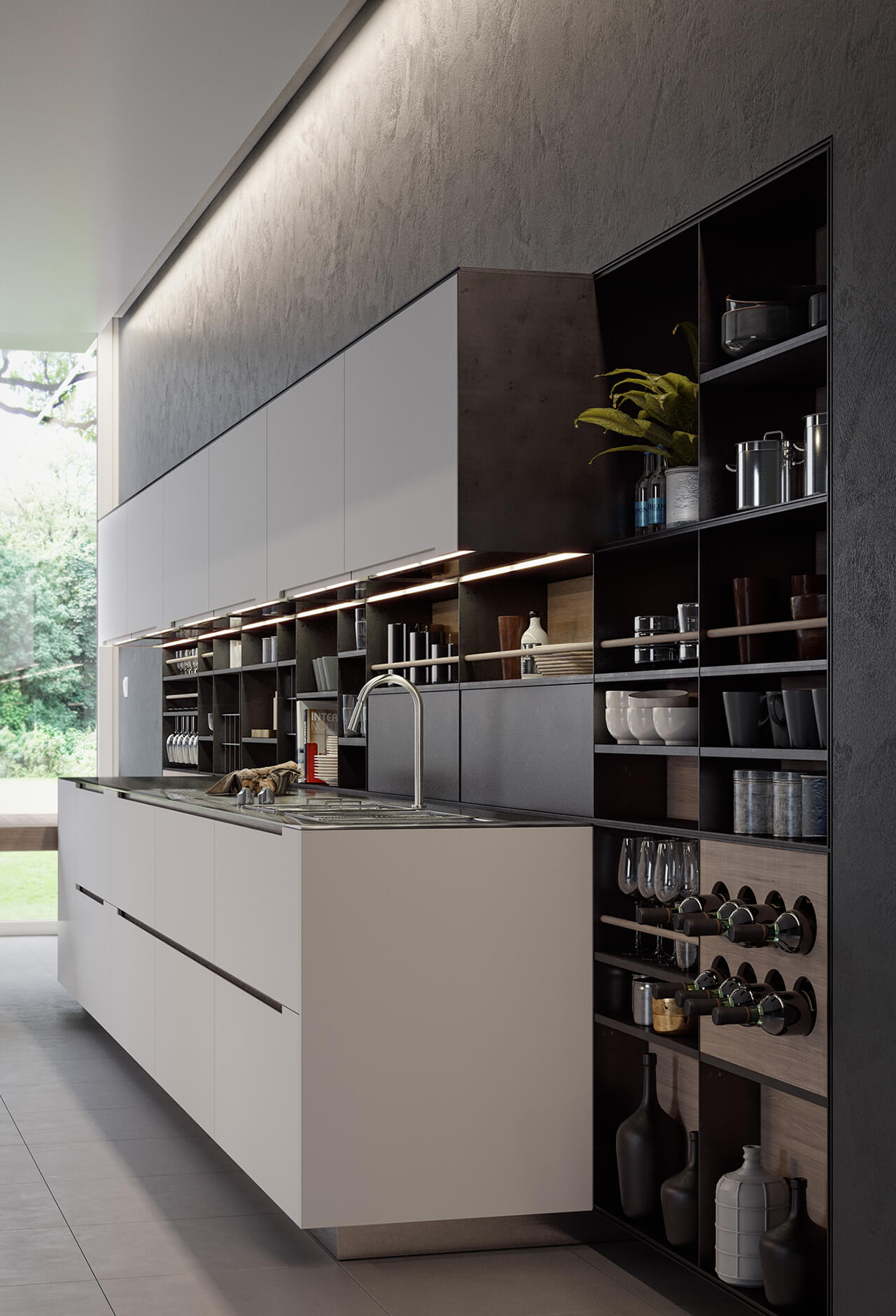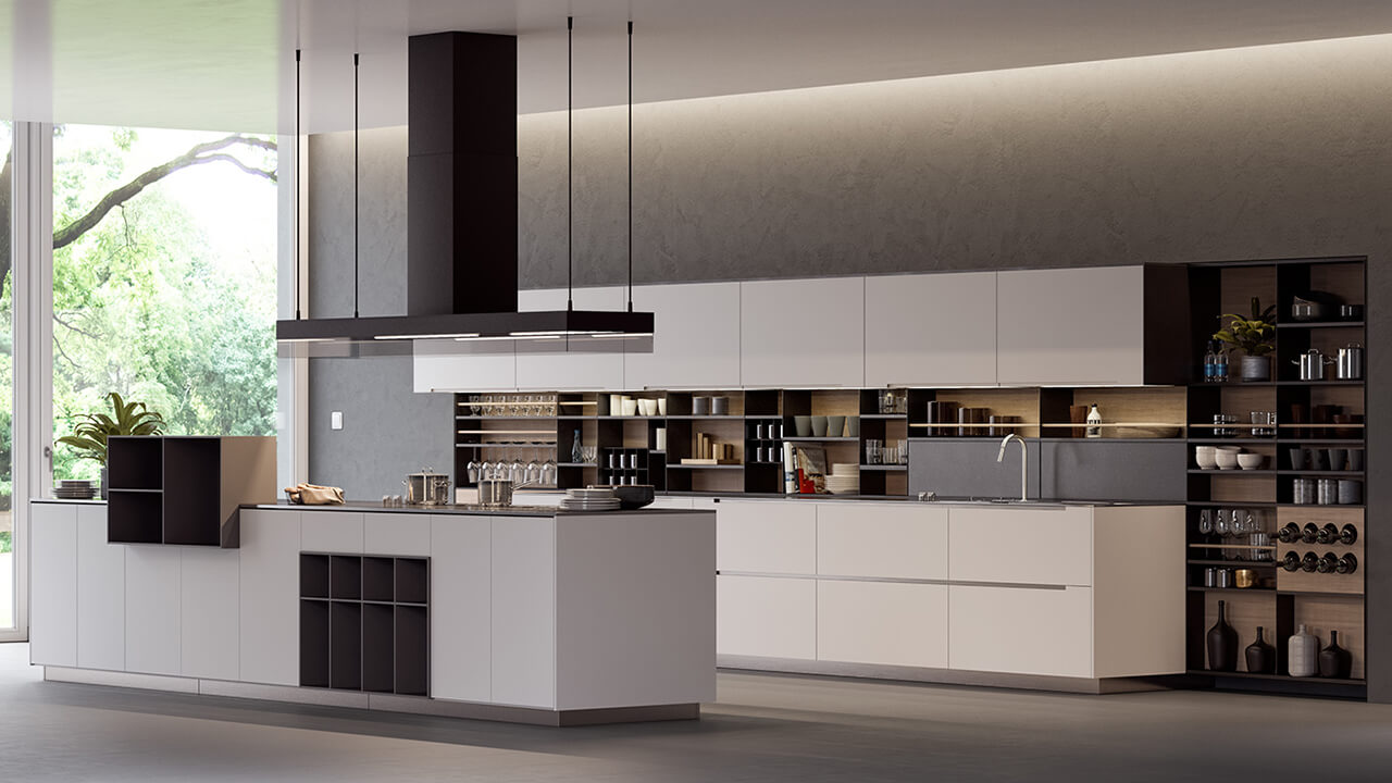 Computer Generated Render Of Modern Italian Kitchen With Island and Open shelving