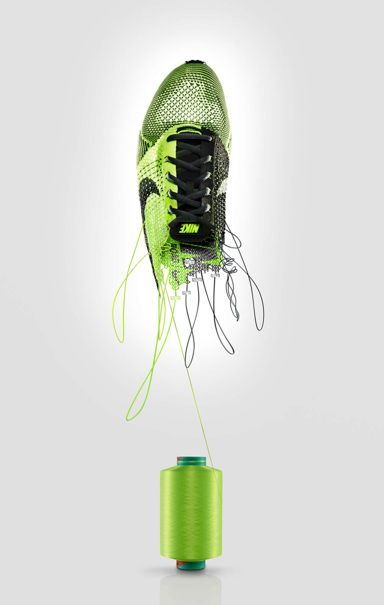 This portfolio is a collection of 3D advertising images created for Nike Flynit comprising CGI rendered deconstructed shoe created in Maya rendered in VRAY.